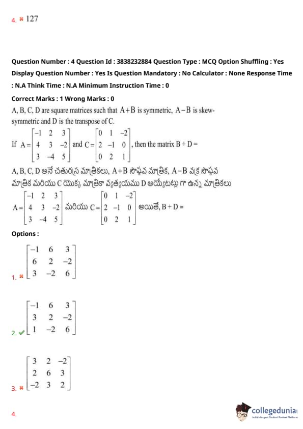 A, B, C, D are square matrices such that A + B is symmetric, A - B is skew-symmetric and D is the transpose of C.