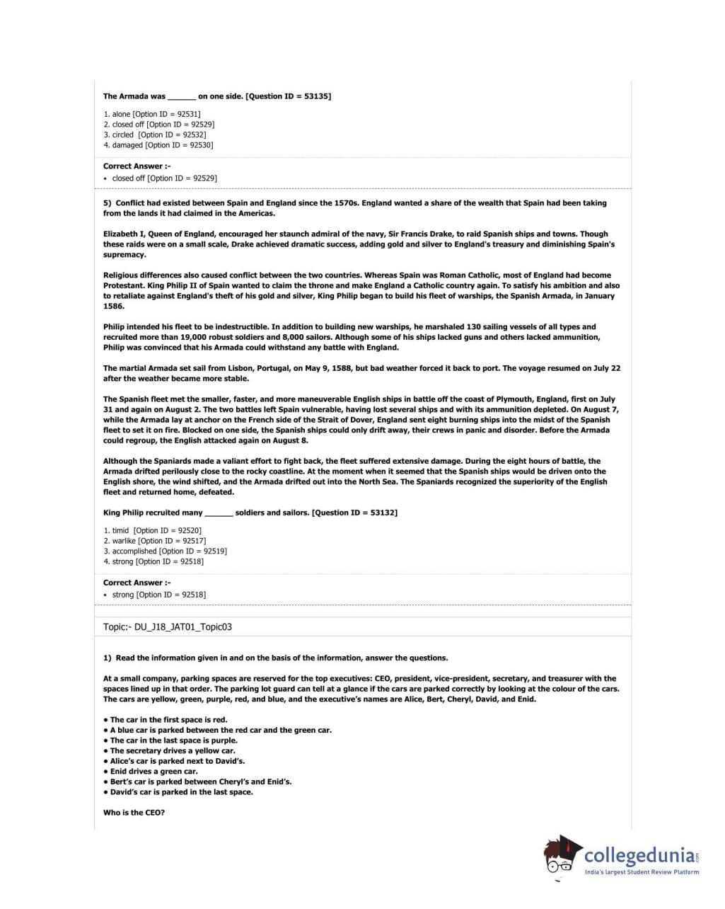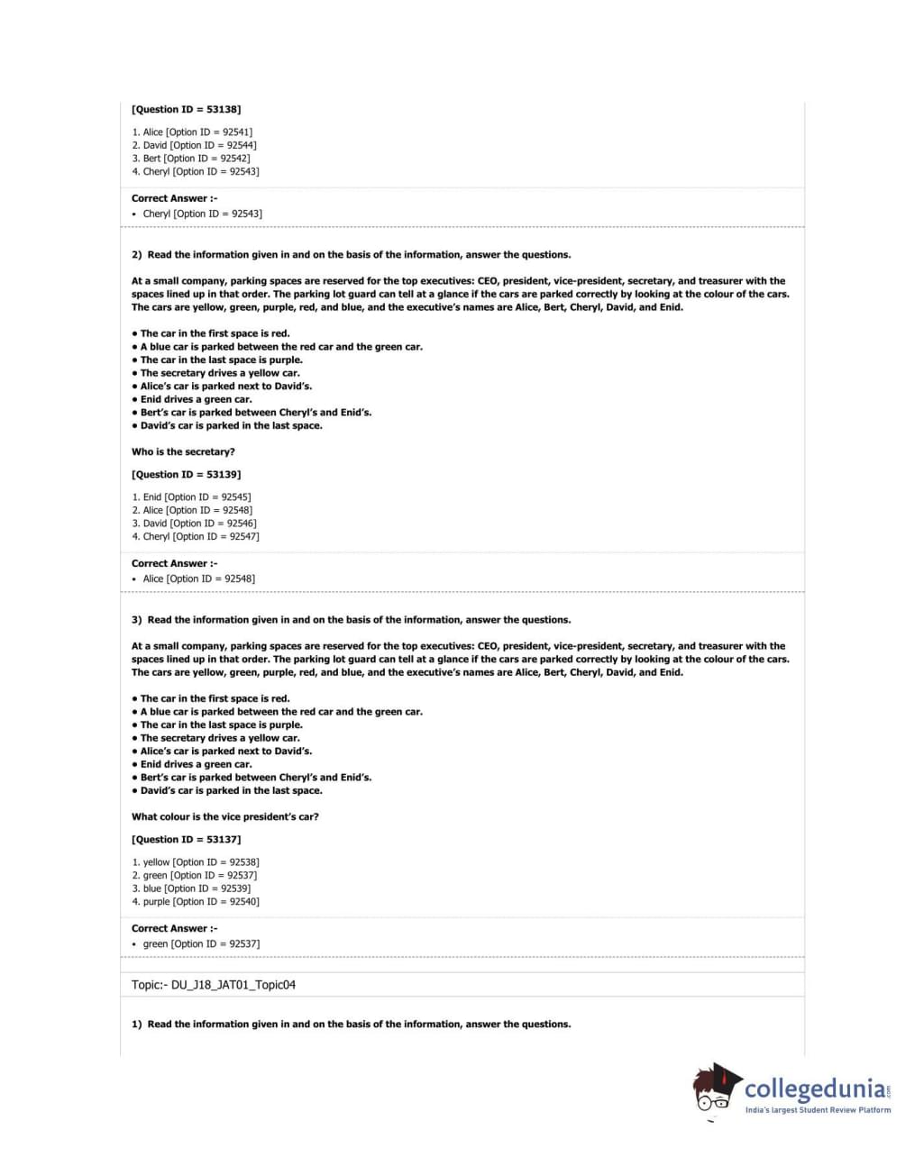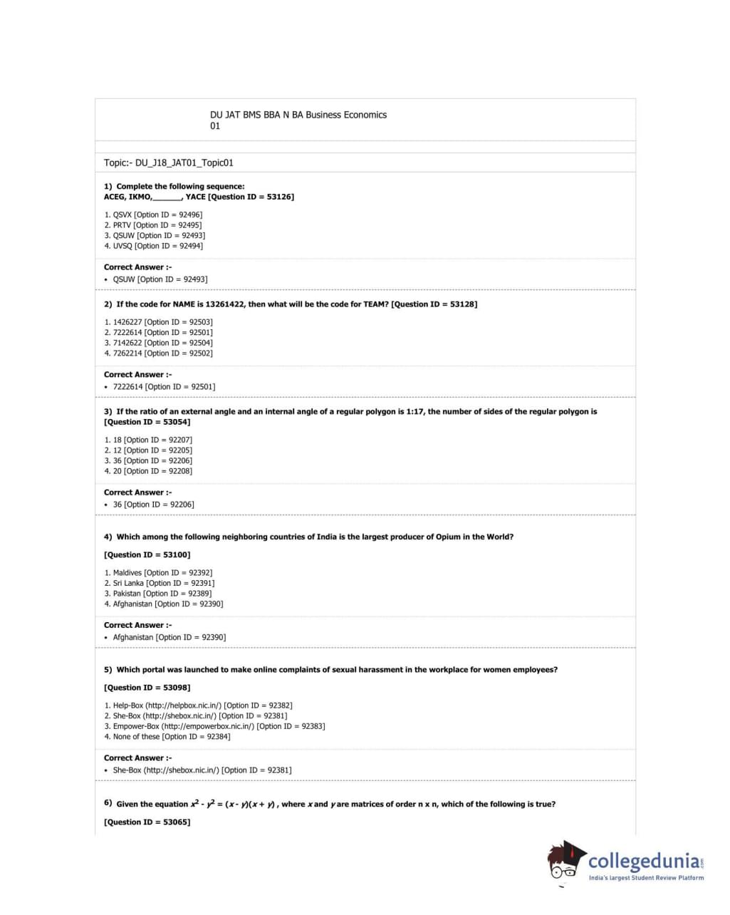 DU JAT 2018 JAT BMS/BBA (FIA) & B.A. (Hons.) Business Economics Question paper with answer key pdf conducted on June 26, 2018 in Shift 1 is available for download. The exam was successfully organized by University of Delhi. The question paper comprised a total of 100 questions.