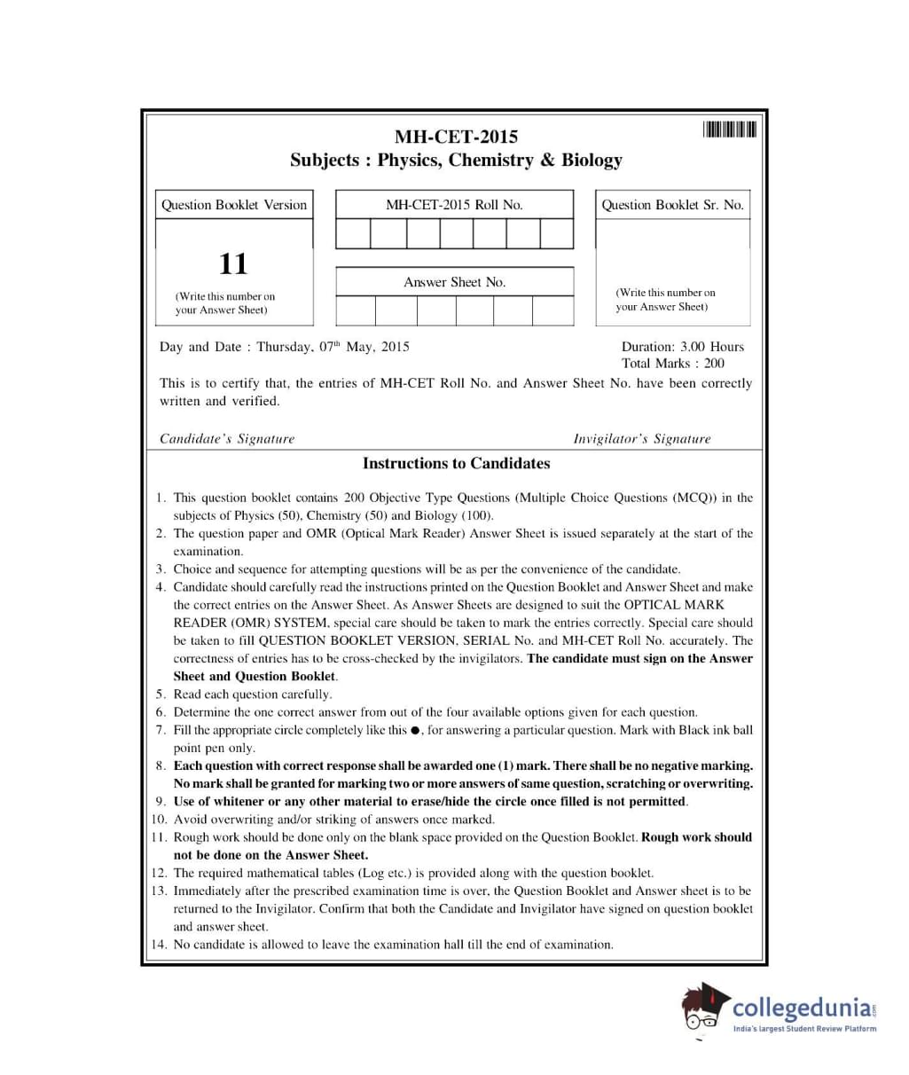 MHT CET 2015 PCB Code 11 Question Paper with Answer Key pdf is available for download. The exam was conducted by Directorate of Medical Education and Research on May 7, 2015 . The question paper comprised a total of 200 questions from General Aptitude and PCB Code 11 topics.