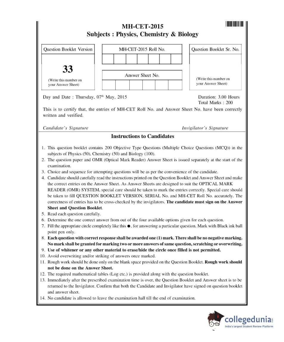 MHT CET 2015 PCB Code 33 Question Paper with Answer Key pdf is available for download. The exam was conducted by Directorate of Medical Education and Research on May 7, 2015 . The question paper comprised a total of 200 questions from General Aptitude and PCB Code 33 topics.