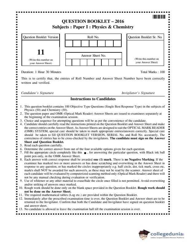 MHT CET 2016 Physics & Chemistry Question paper with answer key pdf conducted on May 5, 2016 for Set - 11 is available for download. The exam was successfully organized by State Common Entrance Test Cell. The question paper comprised a total of 100 questions divided among two sections.