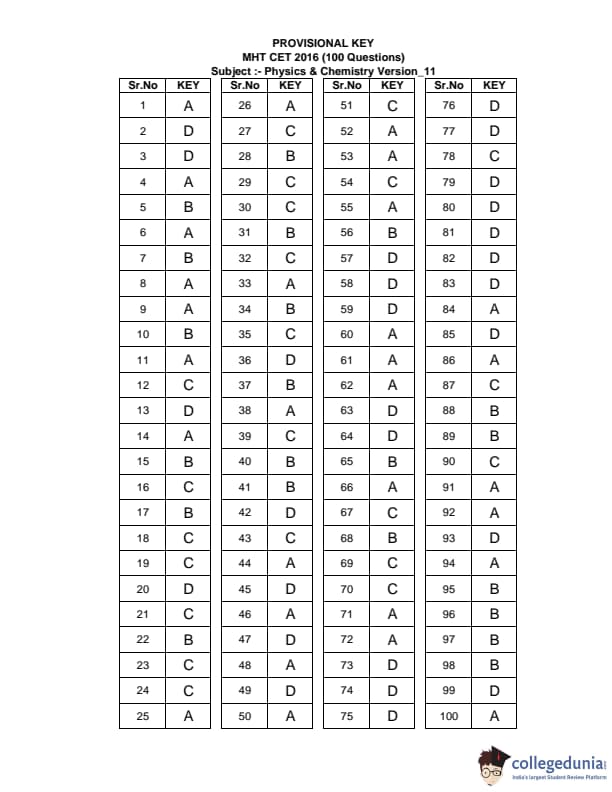 | MHT CET 2016 Physics & Chemistry Question Paper PDF | MHT CET 2016 Physics & Chemistry Answer Key PDF |