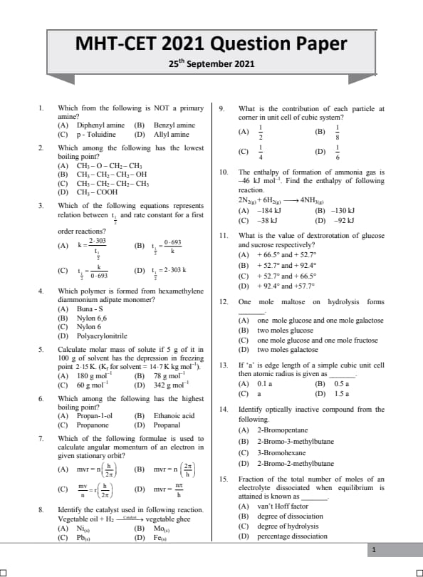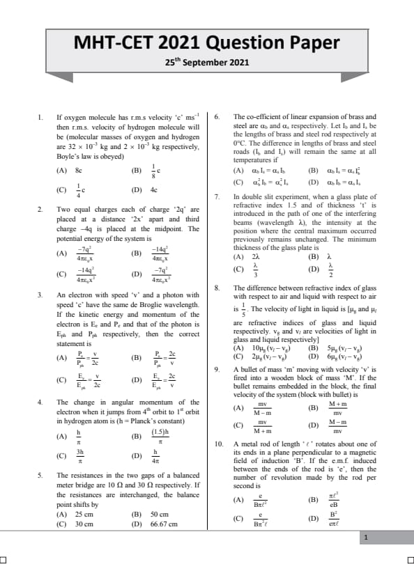 | MHT CET Question Paper 2023 | MHT CET Question Paper 2022 | MHT CET Question Paper 2021 |