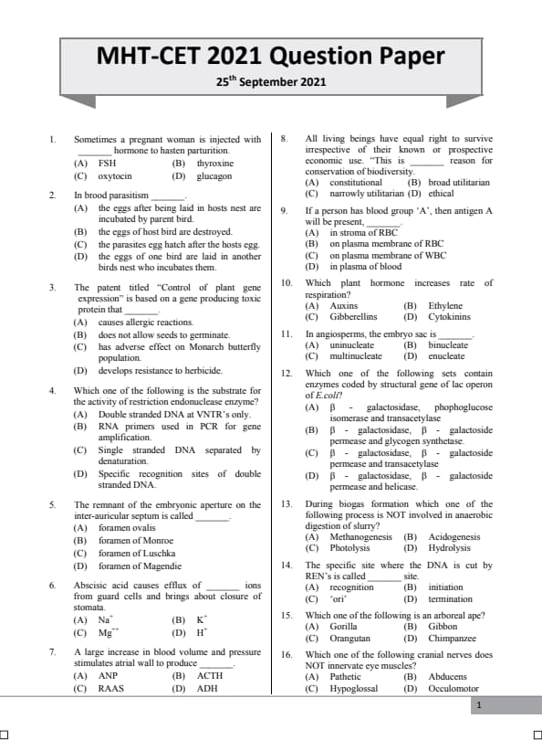 MHT CET 2021 Question Paper is available for download. The exam was conducted by The Department of Higher and Technical Education on September 25, 2021. The question paper comprised a total of 200 questions divided among three sections which are Physics, Chemistry and Biology.