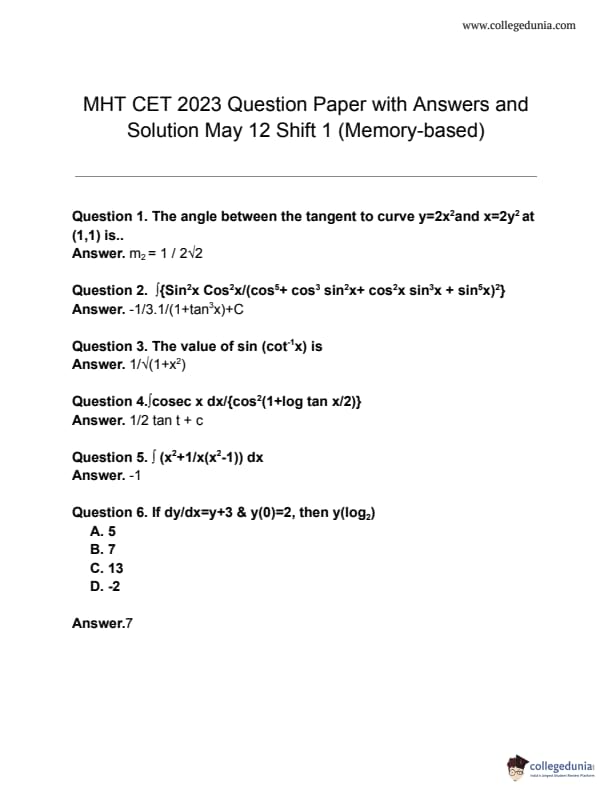 | MHT CET 2020 Question Paper | MHT CET 2019 Question Paper |
