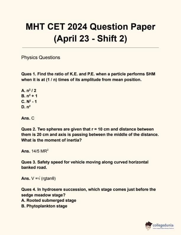 | MHT CET 2024 23 April Shift 2 Question Paper 2024 with Answer Key | Check Solutions |