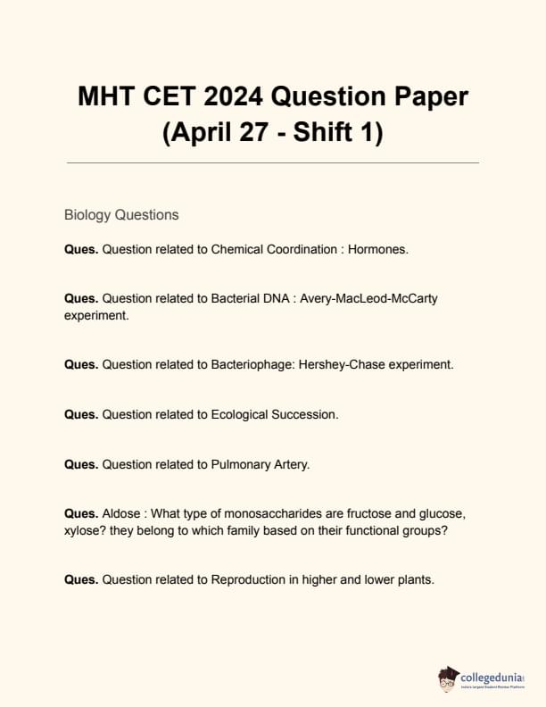 MHT CET 2024 27 April Shift 1 question paper is available for download here. MHT CET 2024 question paper comprises 150 MCQs carrying a total weightage of 200 marks. MHT CET 2024 27 April Shift 1 Question Paper for PCB is divided into three subjects- Physics, Chemistry and Biology.