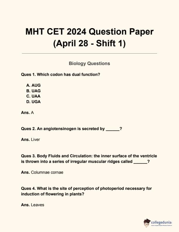 | MHT CET 2024 28 April Shift 1 Question Paper 2024 with Answer Key | Check Solutions |