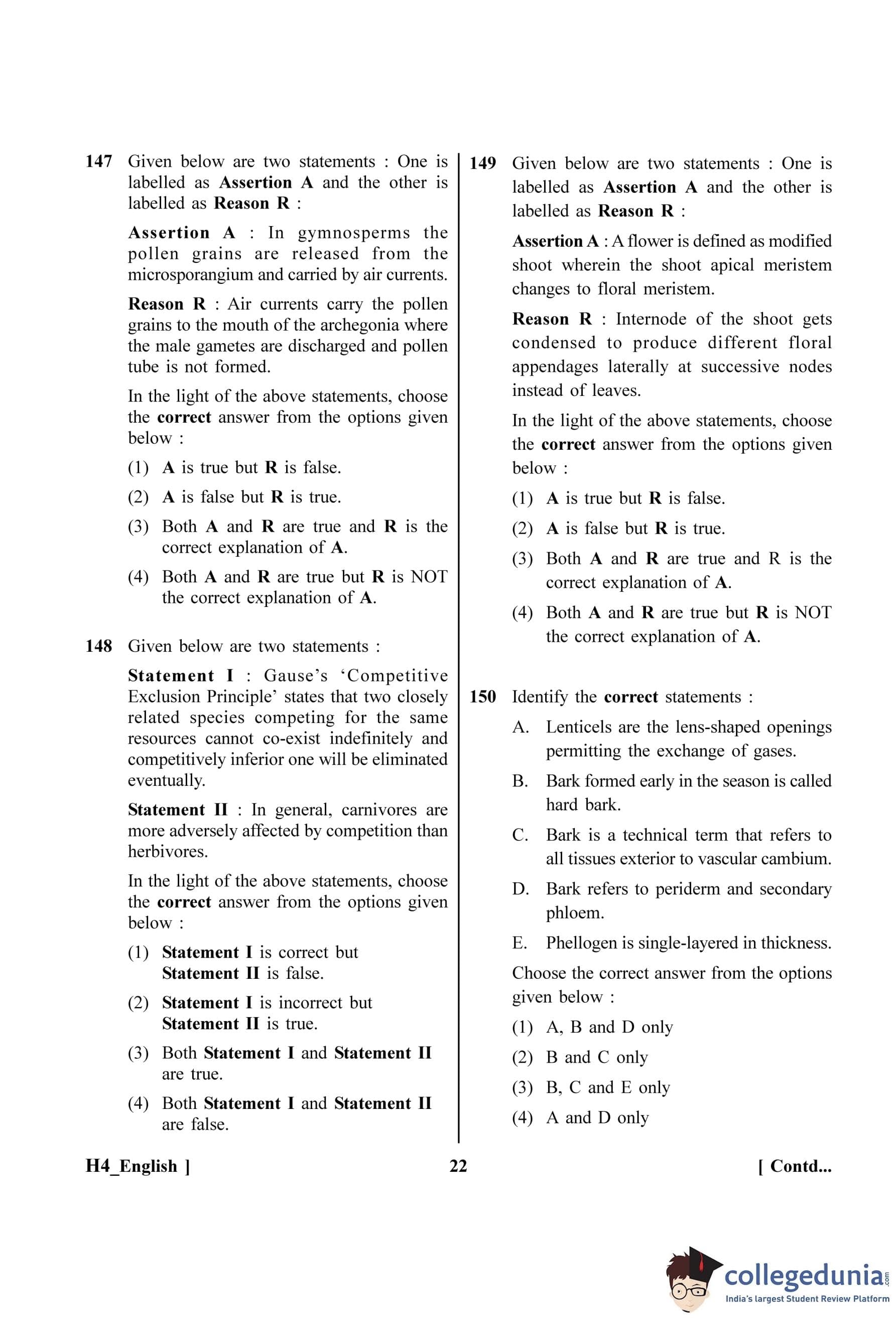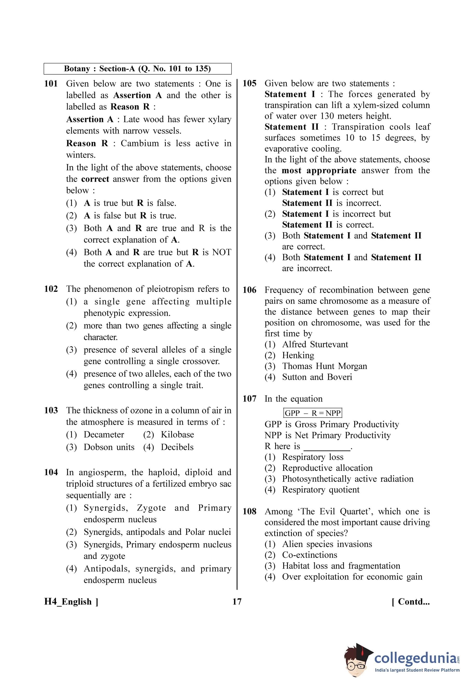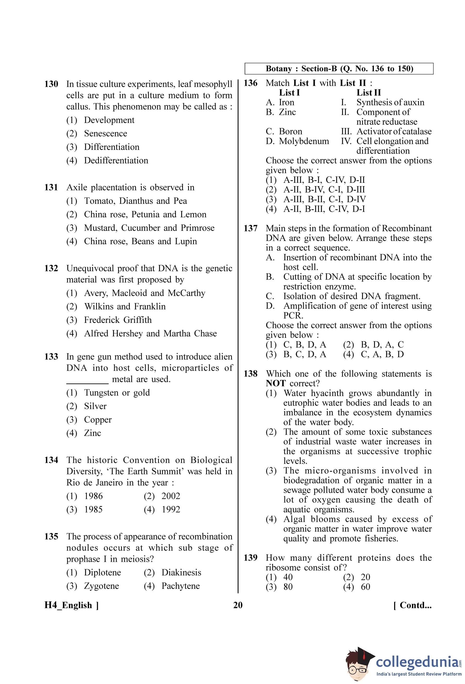 NEET 2023 Botany Question Paper with Solutions PDF H4 is available for download. NEET 2023 H4 Botany Question Paper comprises 50 MCQs out of which only 45 are to be attempted. NEET 2023 question H4 Botany is divided into 2 sections- A (35 questions) and B (15 questions).