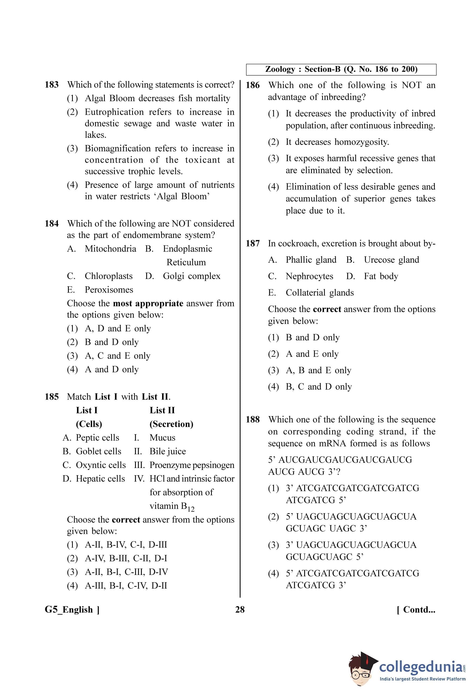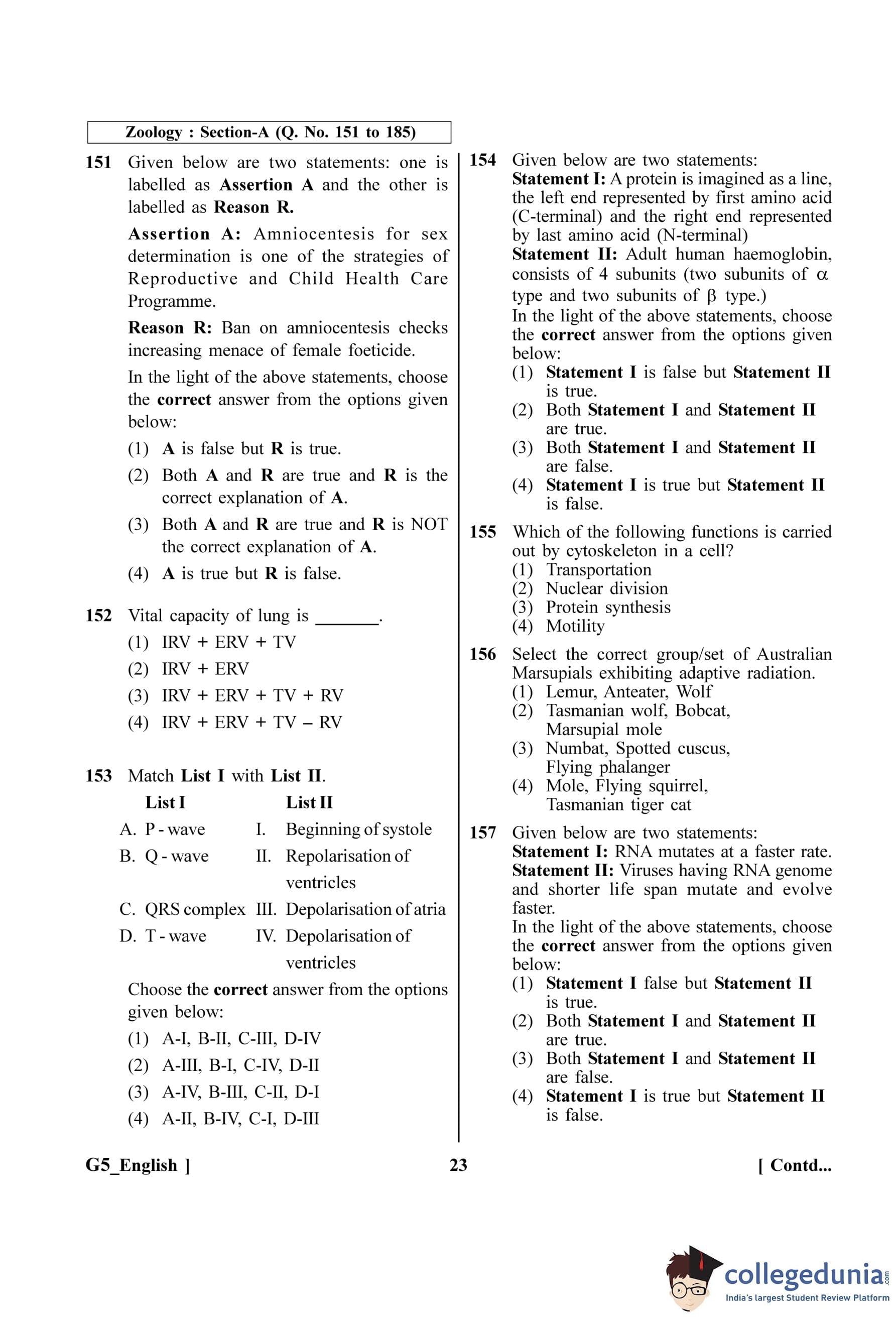 NEET 2023 Question paper with answer key pdf G5 is available for download. NEET 2023 G5 question paper has been conducted by the NTA on May 7, 2023, in pen-paper mode. NEET 2023 question paper code G5 consists of 200 MCQs- 180 to be attempted in 200 minutes. Each of the 4 subjects (Zoology, Botany, Chemistry, Physics) in NEET G5 question paper 2023 have 50 MCQs (45 to be attempted).