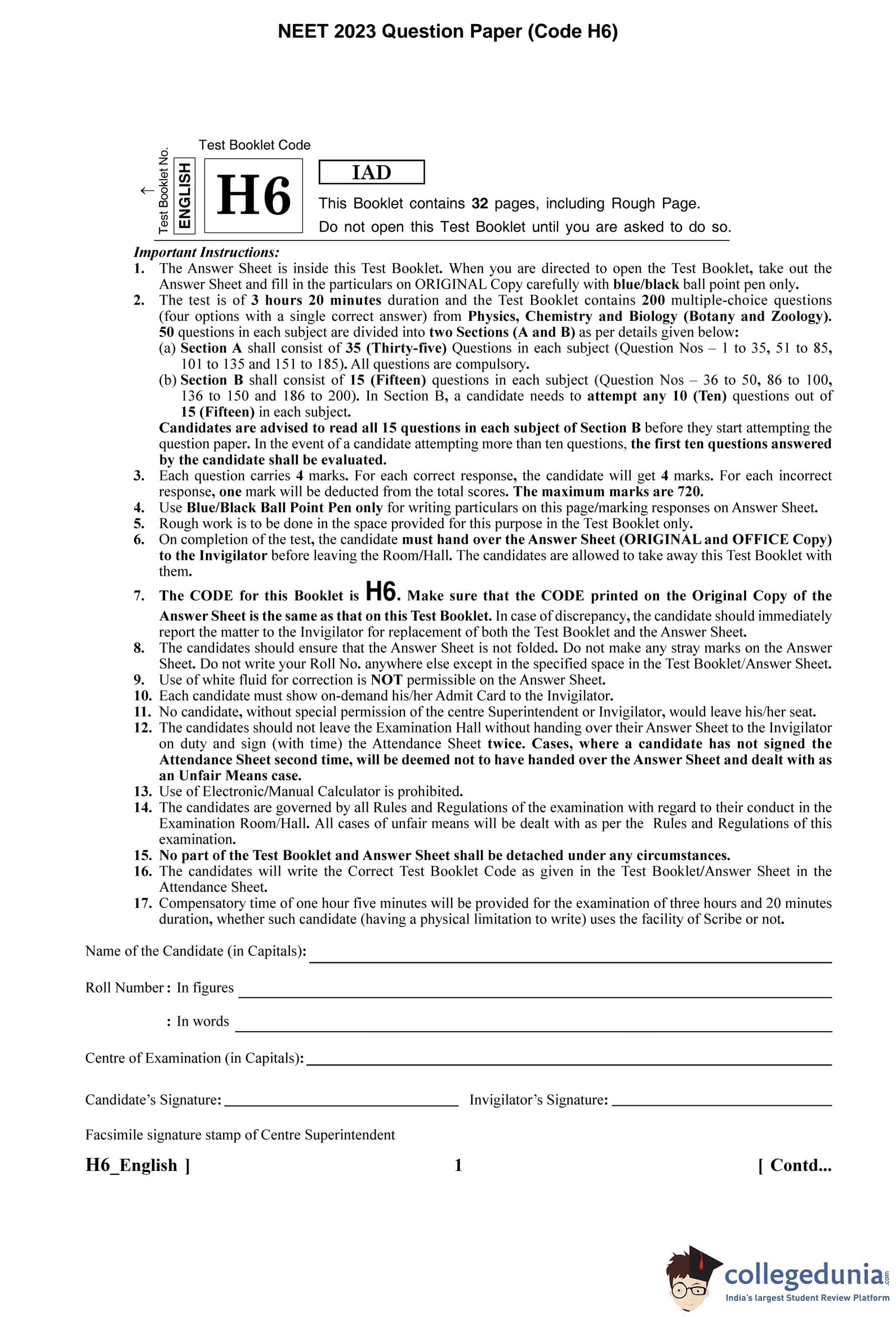 NEET 2023 Question Paper with Answer Key PDF H6 in English
