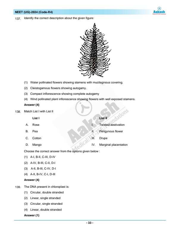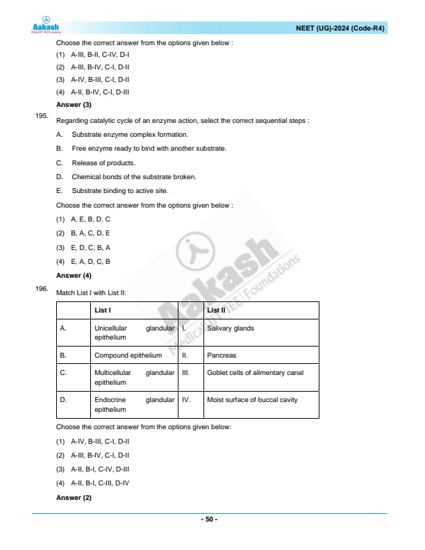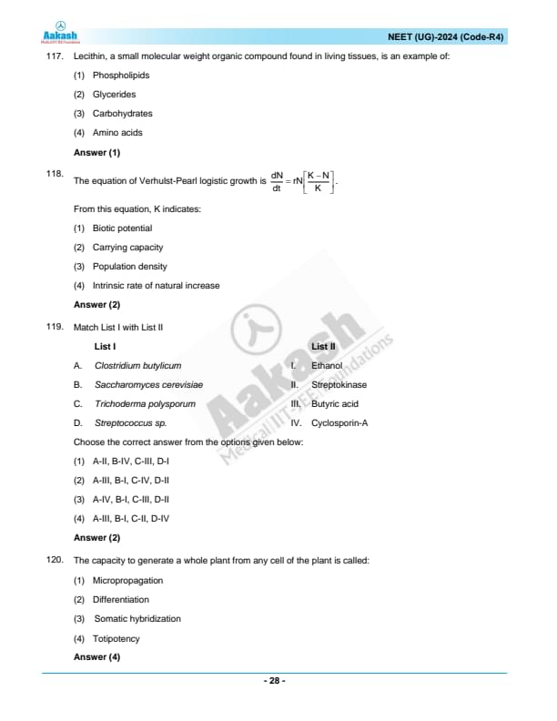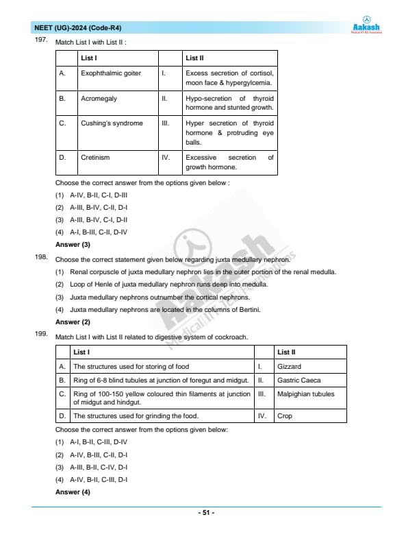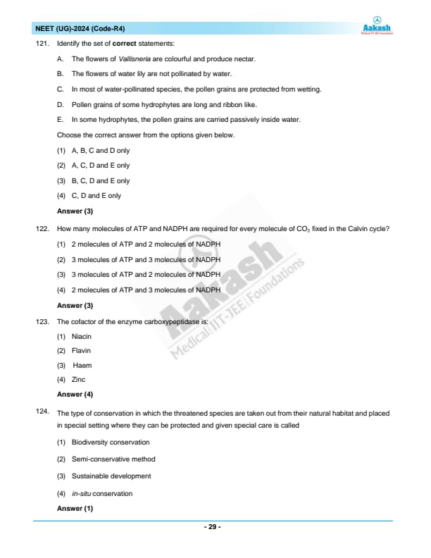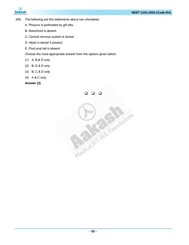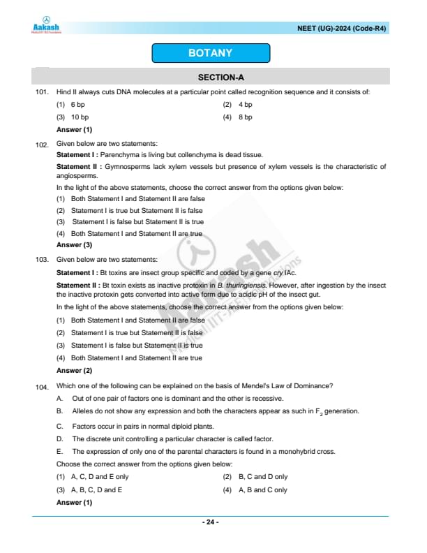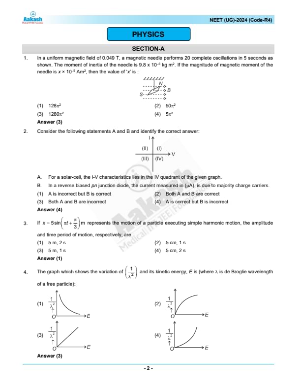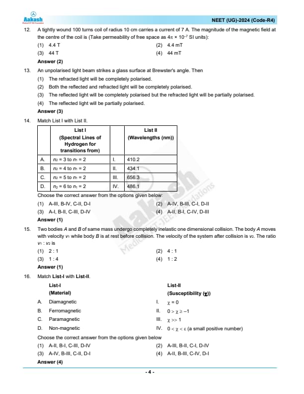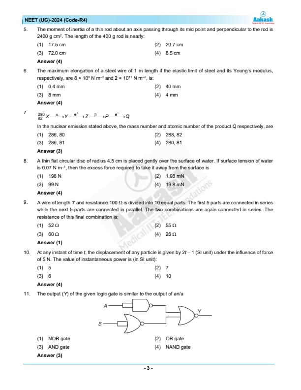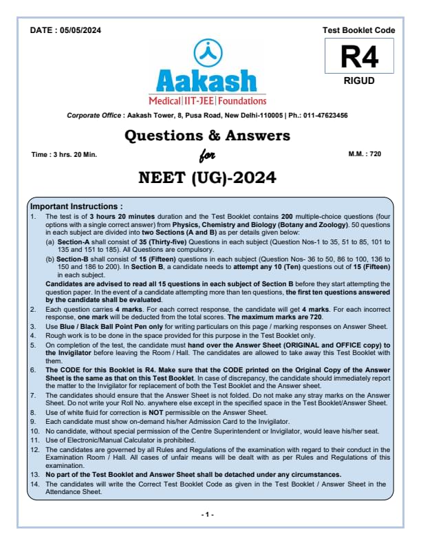 NEET 2024 Question paper with answer key pdf R4 is available for download. NEET 2024 R4 question paper has been conducted by the NTA on May 5, 2024, in pen-paper mode. NEET 2024 question paper code R4 consists of 200 MCQs- 180 to be attempted in 200 minutes. Each of the 4 subjects (Zoology, Botany, Chemistry, Physics) in NEET R4 question paper 2023 have 50 MCQs (45 to be attempted). You can download NEET 2024 question paper with answer key with solutions PDF for R4 using the links given below. [PDF Source: aakash.ac.in]