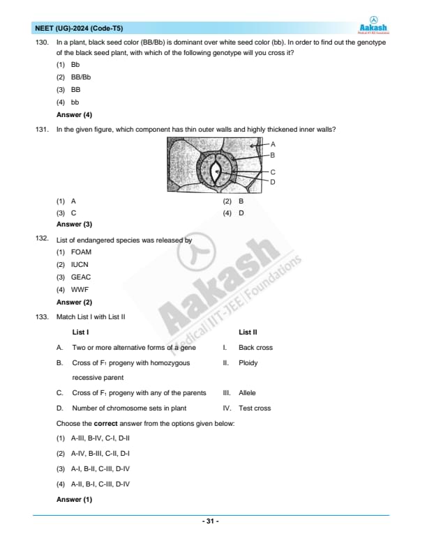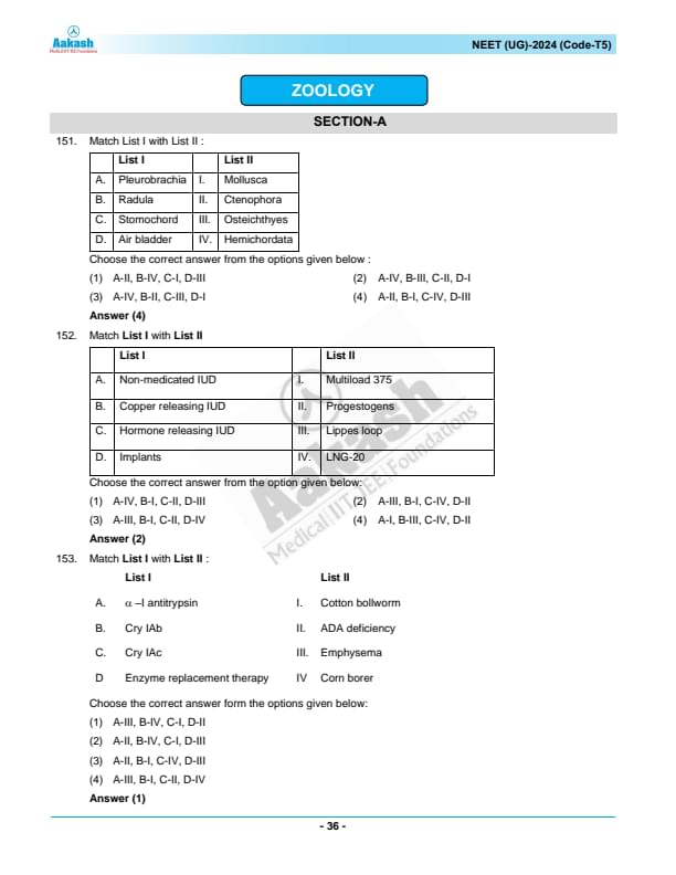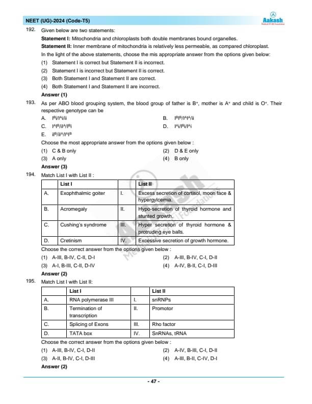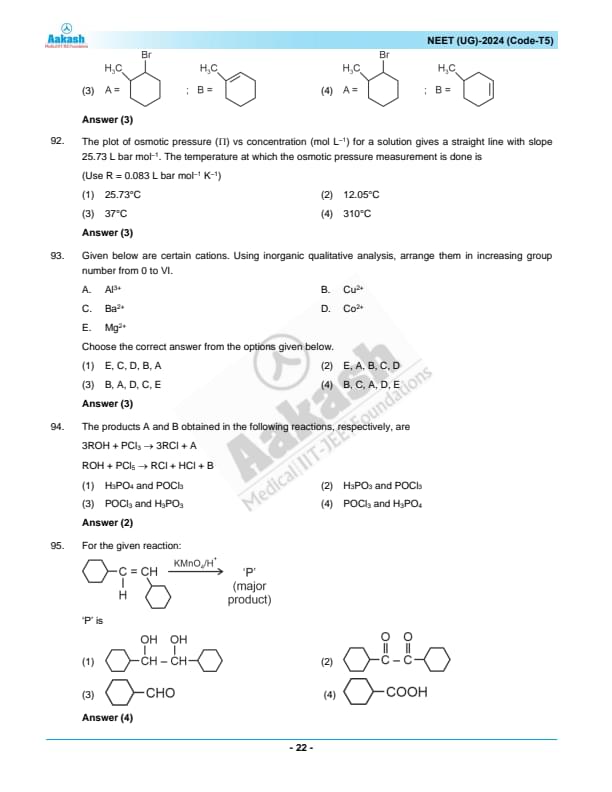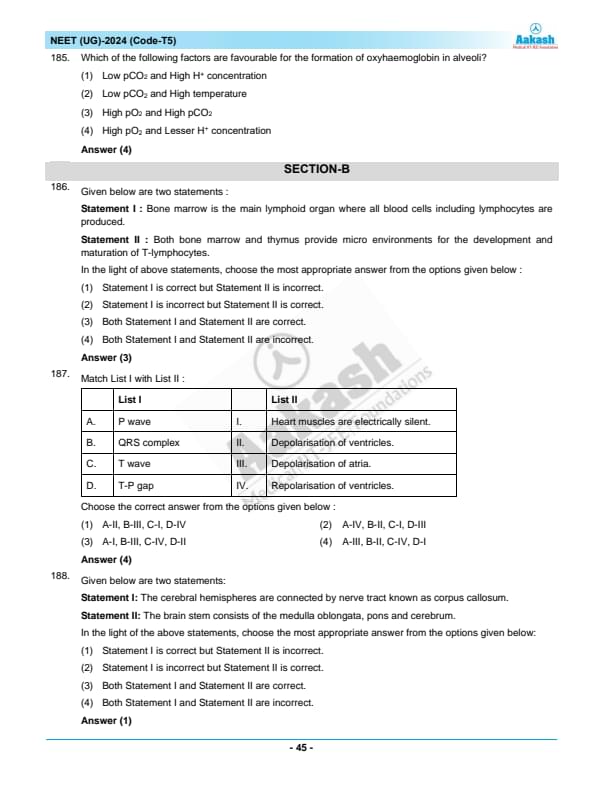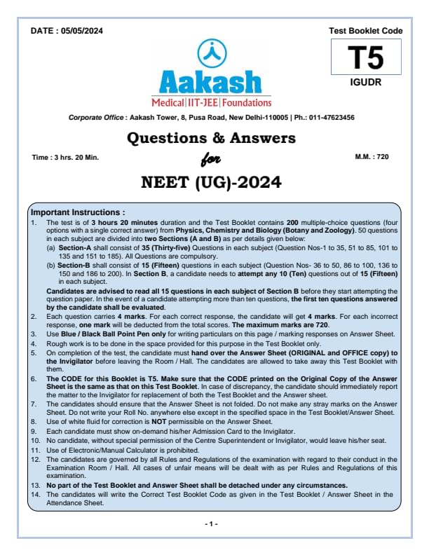 NEET 2024 Question paper with answer key pdf T5 is available for download. NEET 2024 T5 question paper has been conducted by the NTA on May 5, 2024, in pen-paper mode. NEET 2024 question paper code T5 consists of 200 MCQs- 180 to be attempted in 200 minutes. Each of the 4 subjects (Zoology, Botany, Chemistry, Physics) in NEET T5 question paper 2023 have 50 MCQs (45 to be attempted). You can download NEET 2024 question paper with answer key with solutions PDF for T5 using the links given below. Check NEET Cutoff