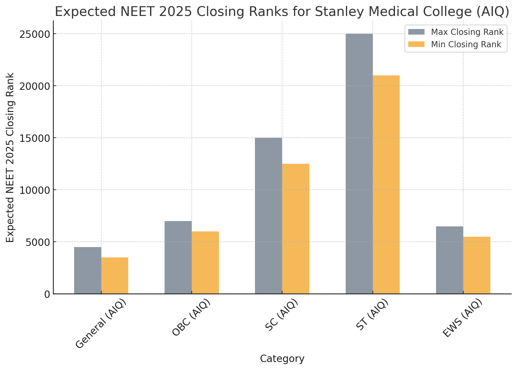 Stanley Medical College and Hospital is one of the earliest and pioneering centers for excellence in the field of medicine in India. The college gives admission to MBBS course completely on the basis of the rank secured in NEET 2025. Candidate having AI Quota securing marks above 550, the probability to enroll in this college will be extremely high whereas a State Quota candidate has to secure 520+ to be on NEET Merit List. Stanley Medical College NEET 2024 AIQ Rank of Round 1, Round 2 and Round 3 for General Category are 2002, 5320 and 8424 respectively.