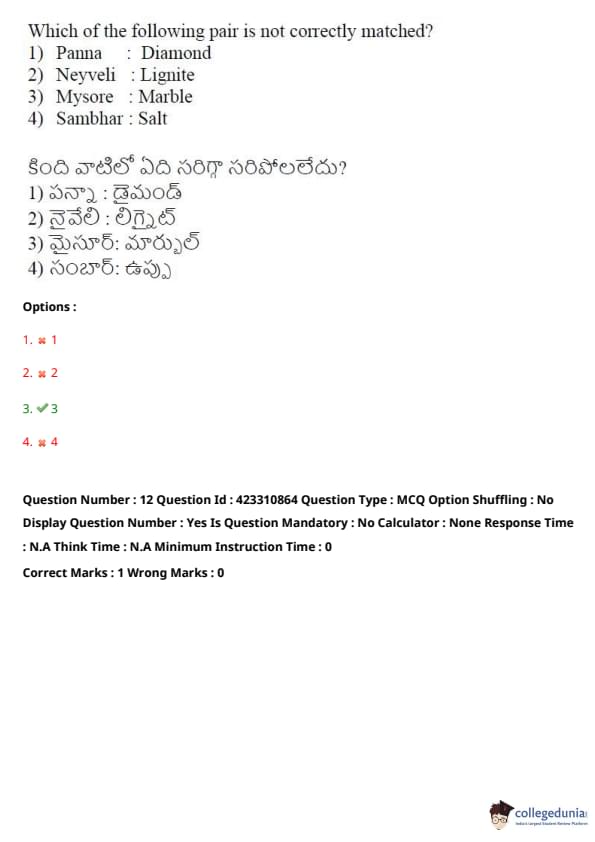 Mysore is not known for marble production. It is primarily known for its silk industry, and marble is more commonly associated with regions like Rajasthan. The other pairs are correctly matched, as Panna is famous for diamonds, Neyveli for lignite, and Sambhar for salt production.