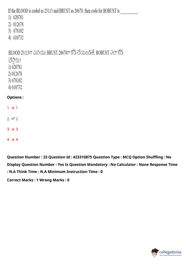 If the BLOOD is coded as 23113 and BRUST as 20678, then code for ROBUST is _____.