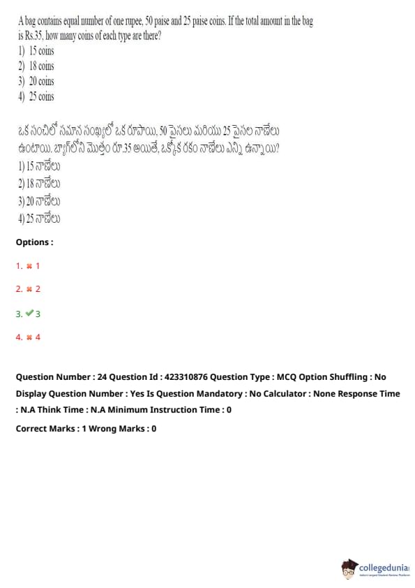 The total amount in the bag is Rs.35, so: \[ x + 0.5x + 0.25x = 35 \] \[ 1.75x = 35 \] \[ x = \frac{35}{1.75} = 20 \]