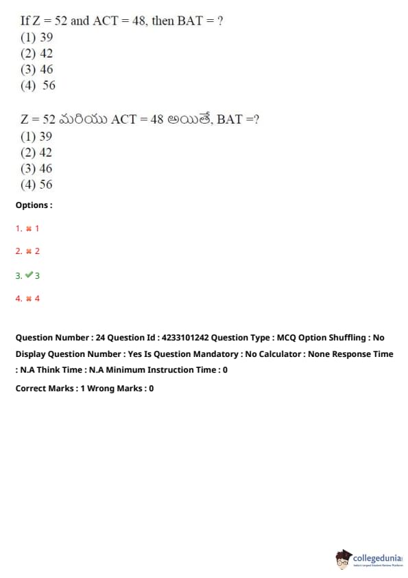 If Z = 52 and ACT = 48, then BAT = ?