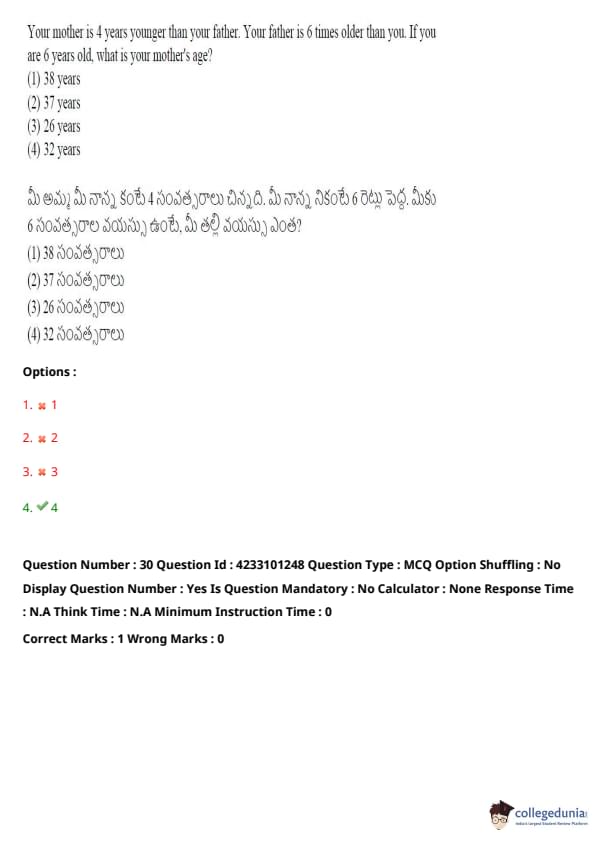 Let your age be \( x = 6 \) years. Your father's age is \( 6x = 36 \) years. Your mother is 4 years younger than your father, so her age is \( 36 - 4 = 32 \) years.