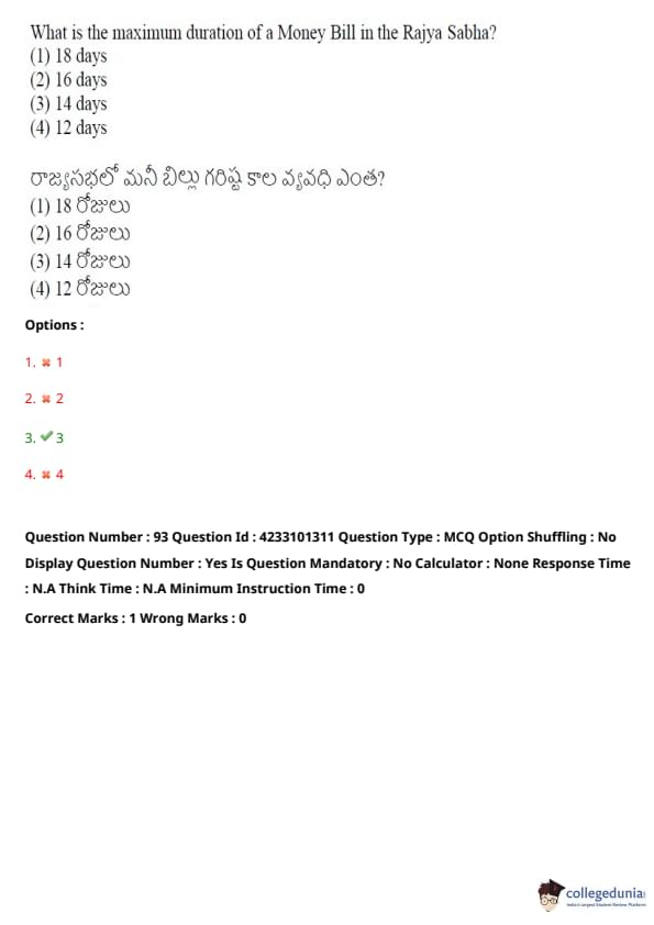 Quick Tip: For Money Bills, the Rajya Sabha cannot reject the bill, but it can delay the passage for a maximum of 14 days.