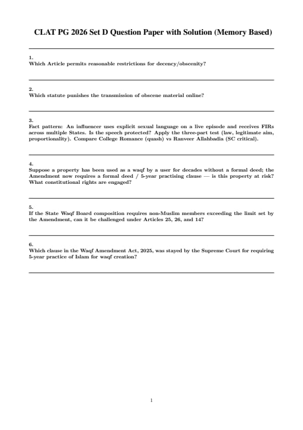 | CLAT 2026 PG Question Paper with Answer Key PDF (Set D) | Download PDF | Check Solutions |