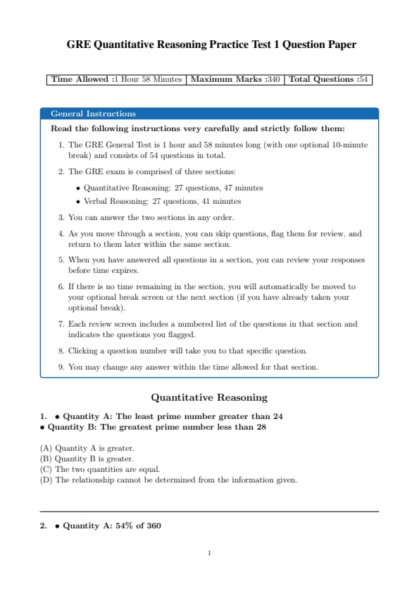 GRE 2024 Quantitative Reasoning Practice Test 1 Question Paper with Solutions PDF is available for download. The overall test time is about 1 hour and 58 minutes. GRE has total 5 sections: