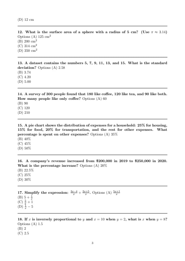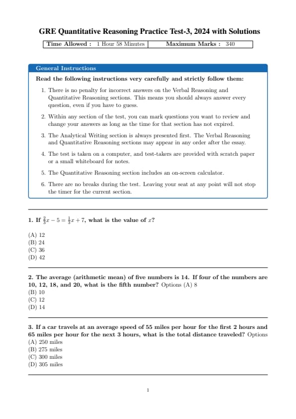 GRE 2024 Quantitative Reasoning Practice Test 3 Question Paper with Solutions PDF is available for download. The overall test time is about 1 hour and 58 minutes. GRE has total 5 sections: