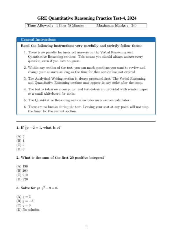 GRE 2024 Quantitative Reasoning Practice Test 4 Question Paper with Solutions PDF is available for download. The overall test time is about 1 hour and 58 minutes. GRE has total 5 sections: