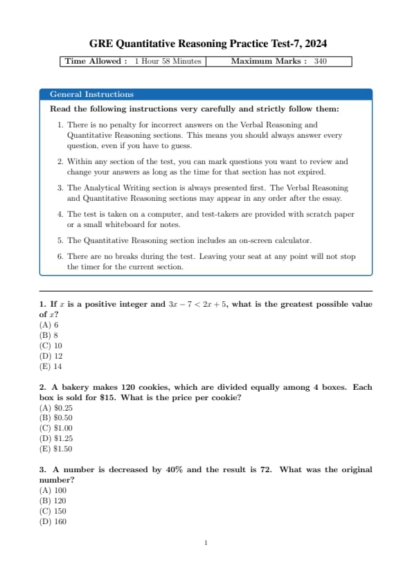GRE 2024 Quantitative Reasoning Practice Test 7 Question Paper with Solutions PDF is available for download. The overall test time is about 1 hour and 58 minutes. GRE has total 5 sections: