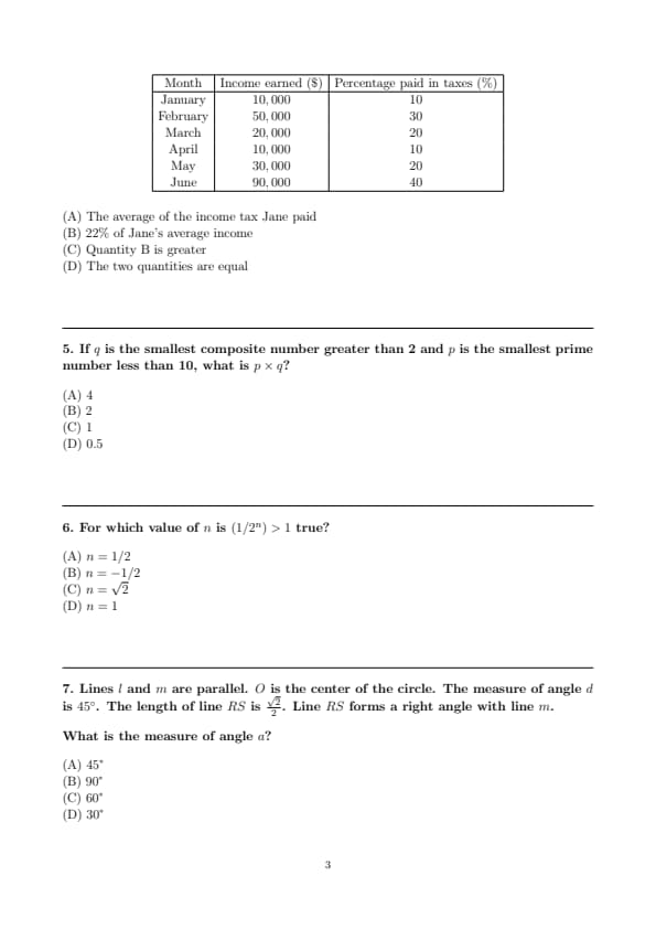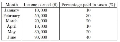 The following table displays the income Jane's business earned and the percentage of that income she paid in taxes for the first half of the year.