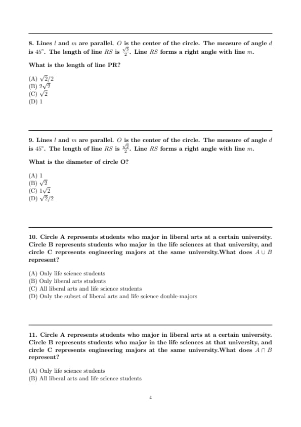 Lines \( l \) and \( m \) are parallel. \( O \) is the center of the circle. The measure of angle \( d \) is \( 45^\circ \). The length of line \( RS \) is \( \frac{\sqrt{2}}{2} \). Line \( RS \) forms a right angle with line \( m \).