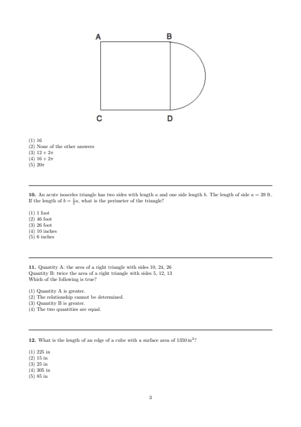 Quantity B: twice the area of a right triangle with sides 5, 12, 13