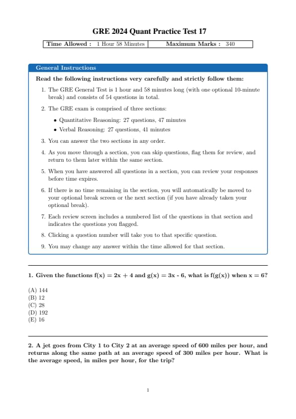 GRE 2024 Quantitative Reasoning Practice Test Set 17 Question Paper with Solutions PDF is available for download. The overall test time is about 1 hour and 58 minutes. GRE has total 5 sections: