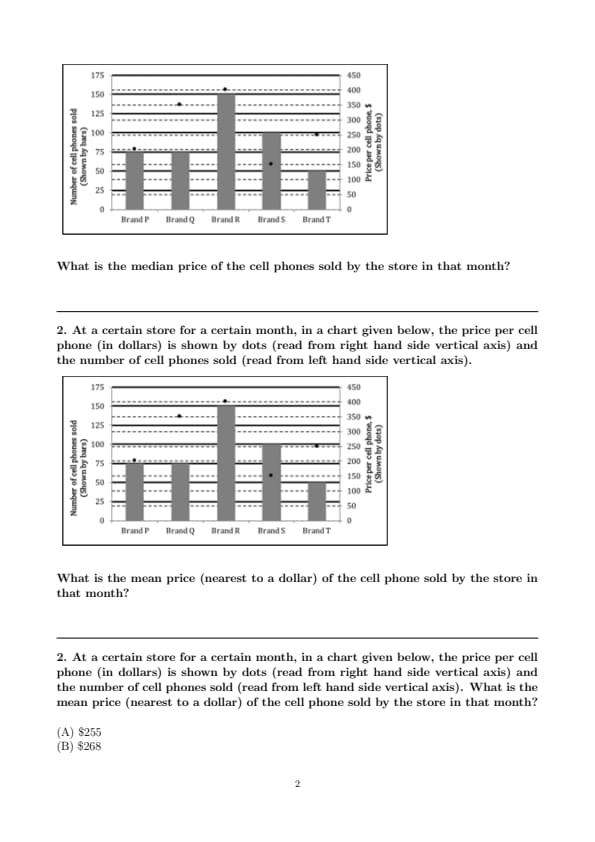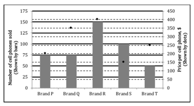 At a certain store for a certain month, in a chart given below, the price per cell phone (in dollars) is shown by dots (read from right hand side vertical axis) and the number of cell phones sold (read from left hand side vertical axis).