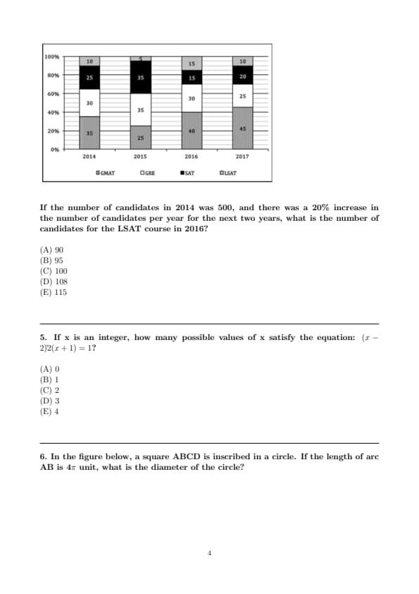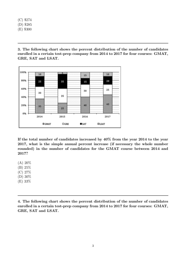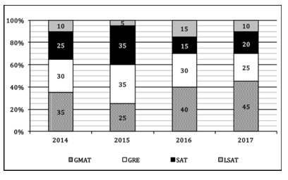 The following chart shows the percent distribution of the number of candidates enrolled in a certain test-prep company from 2014 to 2017 for four courses: GMAT, GRE, SAT and LSAT.