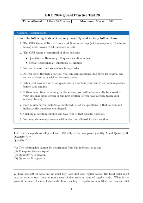 GRE 2024 Quantitative Reasoning Practice Test Set 20 Question Paper with Solutions PDF is available for download. The overall test time is about 1 hour and 58 minutes. GRE has total 5 sections: