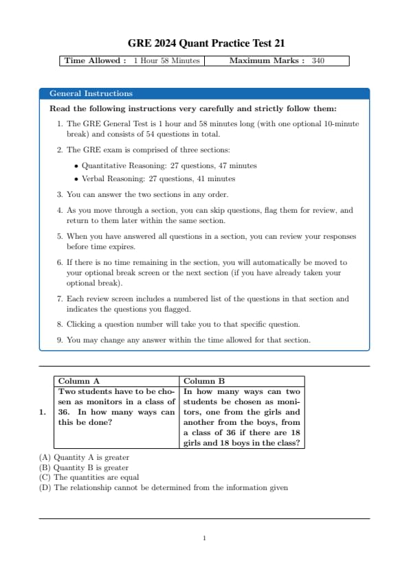 GRE 2024 Quantitative Reasoning Practice Test Set 21 Question Paper with Solutions PDF is available for download. The overall test time is about 1 hour and 58 minutes. GRE has total 5 sections: