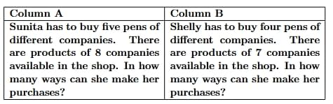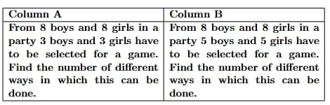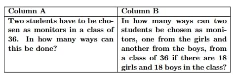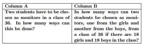 This question compares two different ways of selecting monitors. Column A is a simple combination problem. Column B involves making selections from two distinct subgroups (boys and girls) and uses the multiplication principle.