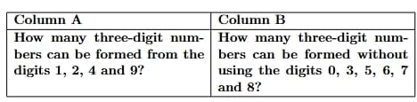 Quick Tip: In quantitative comparison questions, always carefully analyze the wording. Here, "without using the digits..." is an indirect way of specifying the allowed digits. The two columns were designed to look different but result in the same calculation.