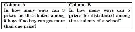 Column A presents a clear permutation problem. We are distributing distinct prizes, so the order matters, and each boy can get at most one. Column B is ambiguous. It lacks crucial information needed for a calculation, such as the number of students, whether prizes are distinct, and if a student can receive more than one prize.
