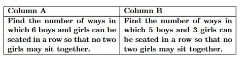 This is a classic permutation problem with a restriction: "no two girls may sit together". We solve this using the "gap method". First, we arrange the items without the restriction (boys) and then place the restricted items (girls) in the gaps created. The phrasing in Column A, "6 boys and girls", is ambiguous. A common interpretation in competitive exams for such phrasing is "6 boys and 6 girls". We will proceed with this assumption.