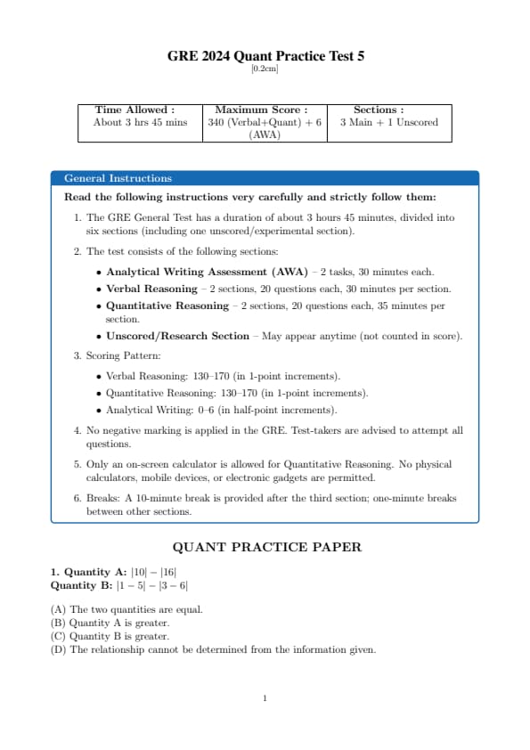 GRE 2024 Quantitative Reasoning Practice Test Set 5 Question Paper with Solutions PDF is available for download. The overall test time is about 1 hour and 58 minutes. GRE has total 5 sections: