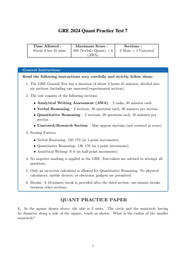 GRE 2024 Qantitative Reasoning Practice Test Set 7 Question Paper with Solutions PDF