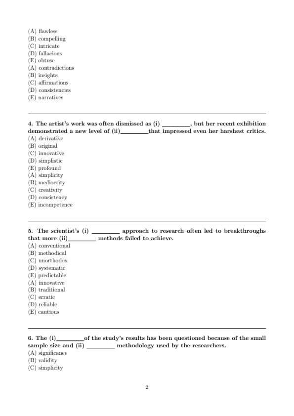 Hence, the correct choices are (B) validity for the first blank and (D) flawed for the second. Quick Tip: Watch for negative cues like “questioned” or “small sample size.” These suggest the sentence is highlighting problems, so look for critical or negative word choices.