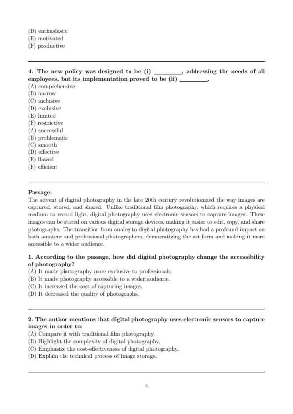 Hence, the correct choices are (A) comprehensive for the first blank and (B) problematic for the second. Quick Tip: Contrast words like “designed to be” versus “implementation proved to be” often signal a positive intention followed by a negative reality.