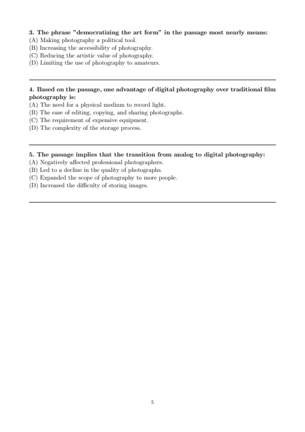 The passage clearly states that digital photography ``democratized the art form and made it more accessible to a wider audience.'' This means that digital photography allowed more people, regardless of background or expertise, to participate in and enjoy photography. Therefore, option (B) is directly supported by the passage.