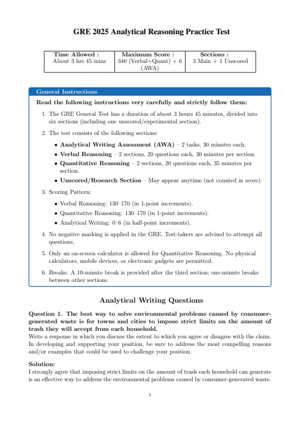 GRE 2025 Analytical Reasoning Sample Paper Set 1 Question Paper with Solutions PDF is available for download. The overall test time is about 1 hour and 58 minutes. GRE has total 5 sections: