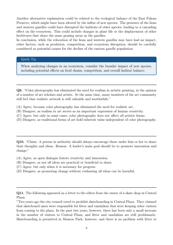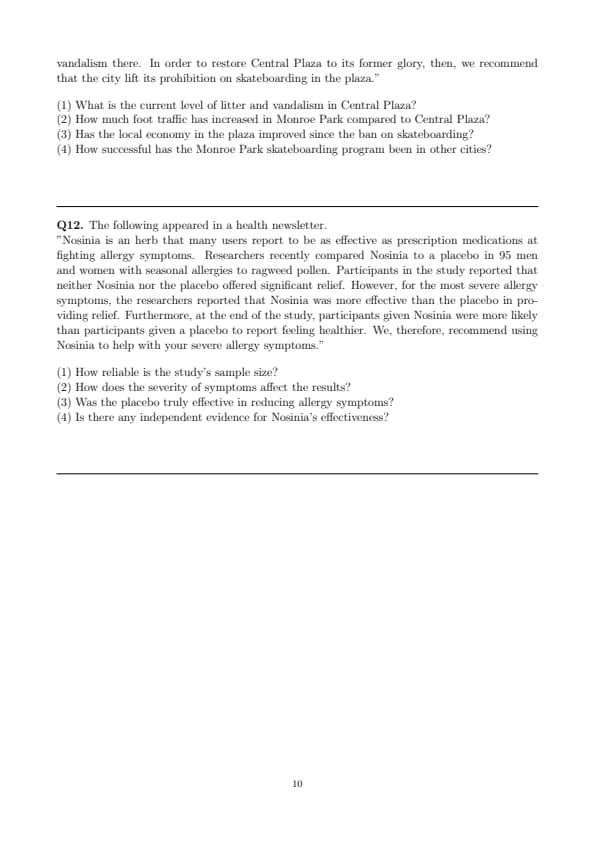 "Two years ago the city council voted to prohibit skateboarding in Central Plaza. They claimed that skateboard users were responsible for litter and vandalism that were keeping other visitors from coming to the plaza. In the past two years, however, there has been only a small increase in the number of visitors to Central Plaza, and litter and vandalism are still problematic. Skateboarding is permitted in Monroe Park, however, and there is no problem with litter or vandalism there. In order to restore Central Plaza to its former glory, then, we recommend that the city lift its prohibition on skateboarding in the plaza."