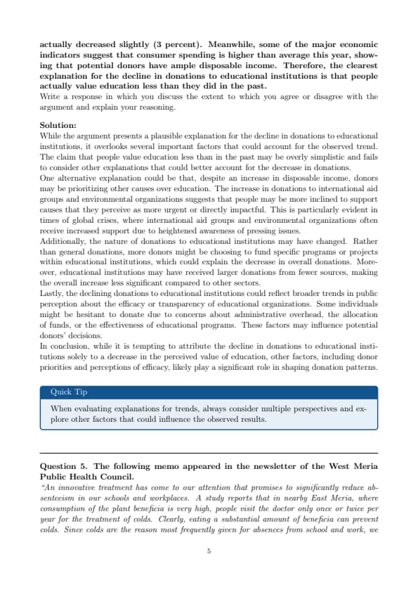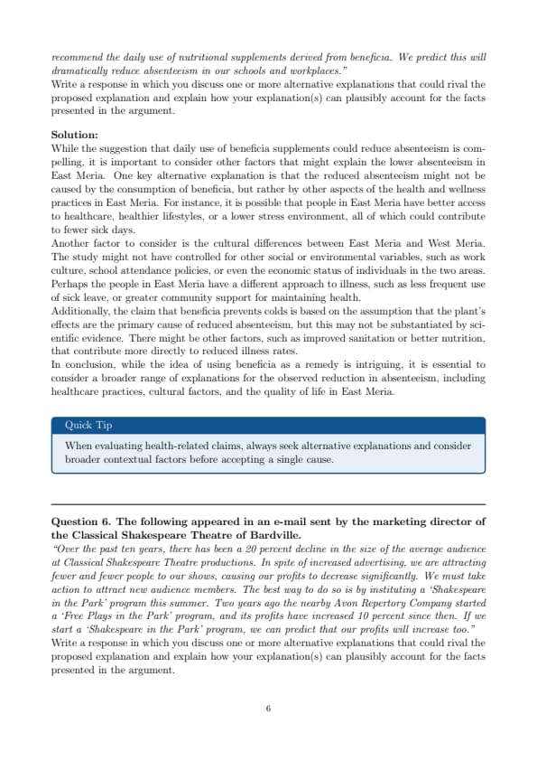 “An innovative treatment has come to our attention that promises to significantly reduce absenteeism in our schools and workplaces. A study reports that in nearby East Meria, where consumption of the plant beneficia is very high, people visit the doctor only once or twice per year for the treatment of colds. Clearly, eating a substantial amount of beneficia can prevent colds. Since colds are the reason most frequently given for absences from school and work, we recommend the daily use of nutritional supplements derived from beneficia. We predict this will dramatically reduce absenteeism in our schools and workplaces.”