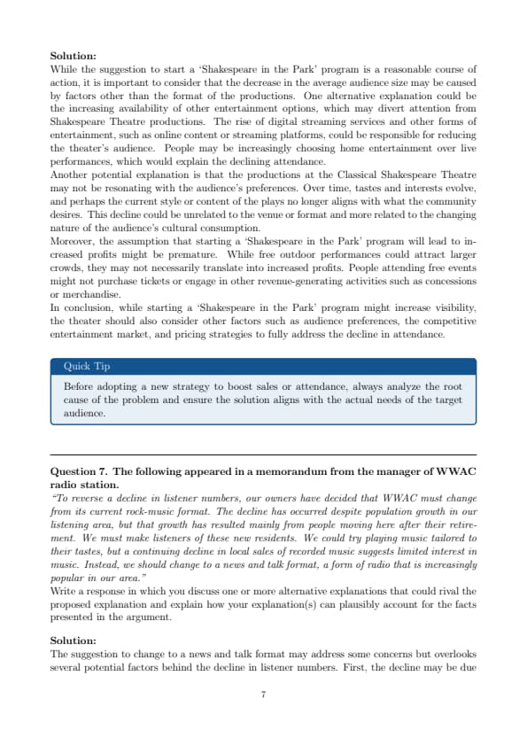 “Over the past ten years, there has been a 20 percent decline in the size of the average audience at Classical Shakespeare Theatre productions. In spite of increased advertising, we are attracting fewer and fewer people to our shows, causing our profits to decrease significantly. We must take action to attract new audience members. The best way to do so is by instituting a ‘Shakespeare in the Park’ program this summer. Two years ago the nearby Avon Repertory Company started a ‘Free Plays in the Park’ program, and its profits have increased 10 percent since then. If we start a ‘Shakespeare in the Park’ program, we can predict that our profits will increase too.”